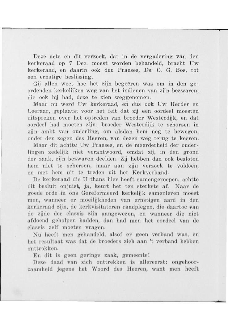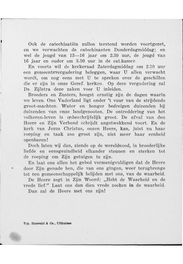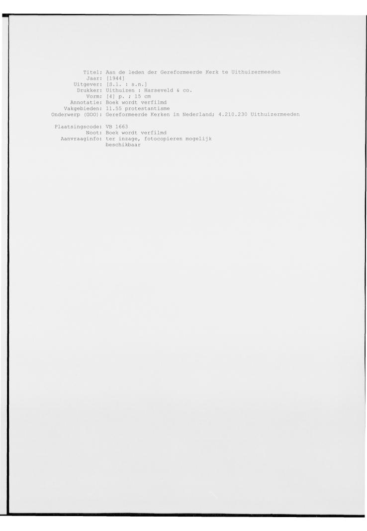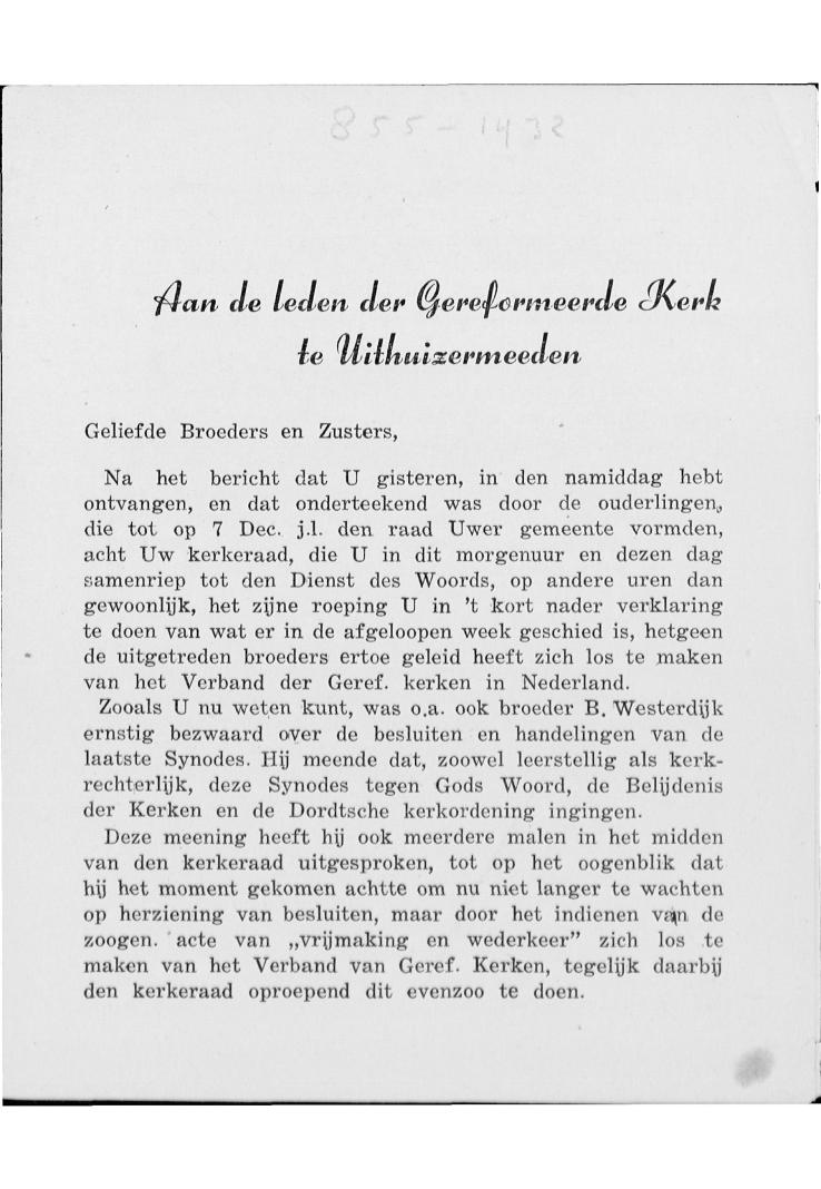 Aan de leden der Gereformeerde Kerk te Uithuizermeeden. Geliefde Broeders en Zusters, Na het bericht dat u gisteren … /